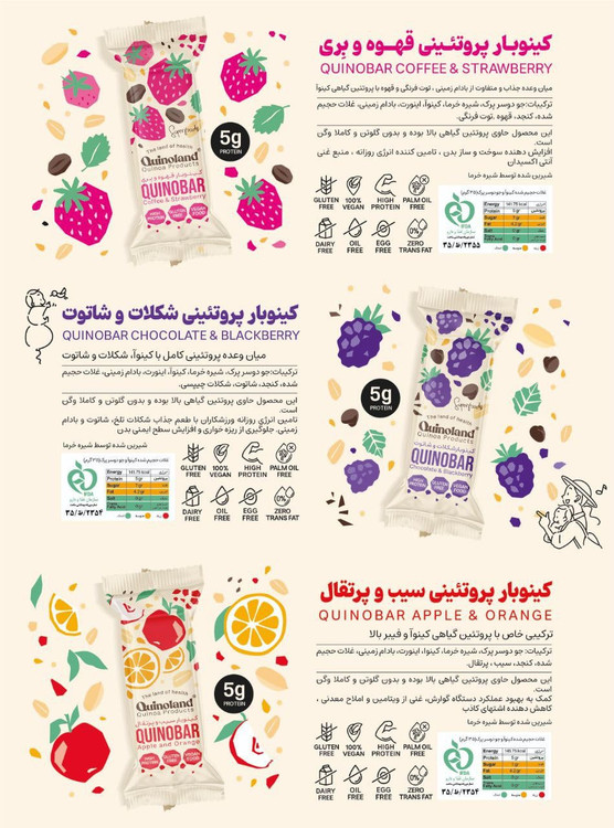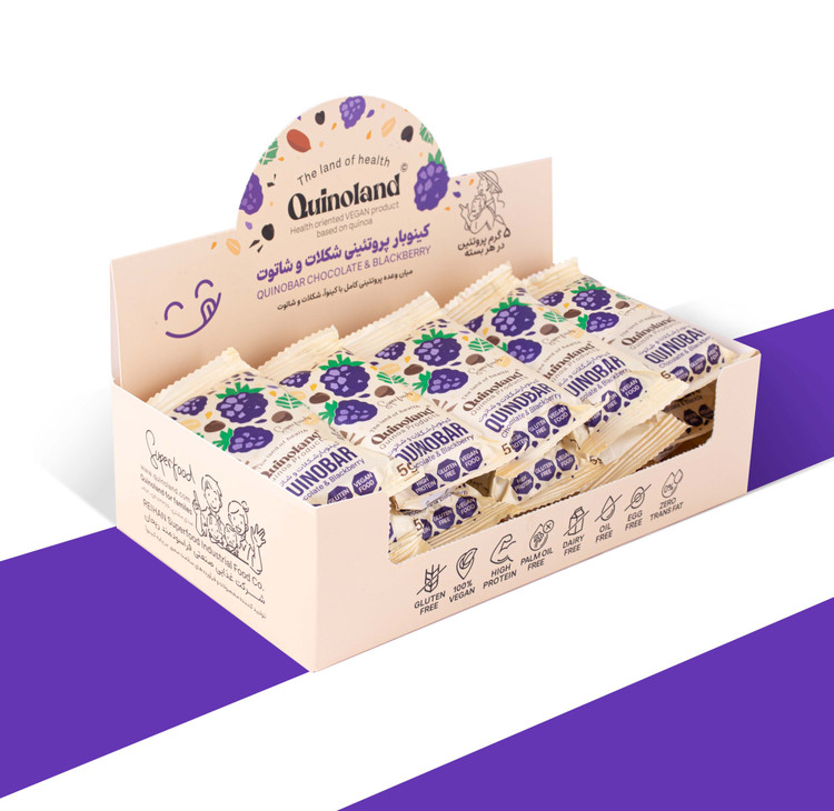 این محصول رژیمی و سرشار از پروتئین تهیه شده از کنجد ،شاه توت،شکلات،بادام زمینی و غلات شده است .این محصول غنی از پروتئین گیاهی و بدون گلوتن و کاملا وگن میباشد .با مصرف این کینوبار تمام روز سیر خواهید بود همچنین این محصول یک میان وعده عالی برای ورزشکاران با رژیم های غذایی خاص است و از ریزه خواری جلوگیری میکند .یکی از اصلی ترین ترکیبات این محصول شاه توت است که خواص بیشماری دارد از جمله خواص شاه توت می توان به این موارد اشاره کرد: