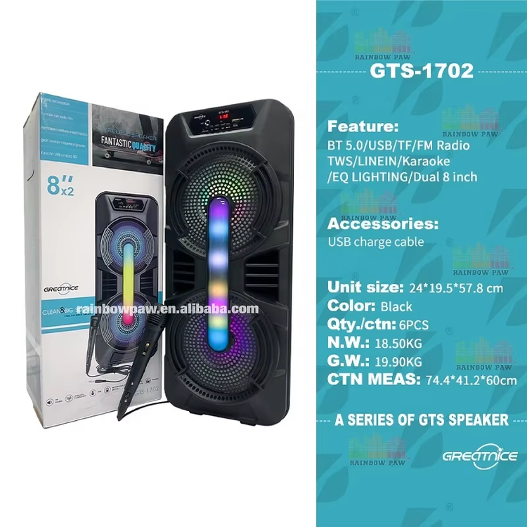 اسپیکر بلوتوثی GTS 1702 دو بلندگوی 8 اینچی با نورپردازی LED، ورودی USB/TF و کارائوکه