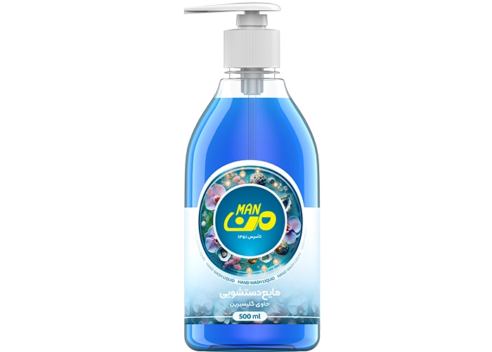 مایع دستشویی گلیسیرینه آبی 500 میلی لیتر برند من – نرم کننده و مرطوب کننده پوست