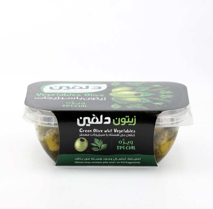 ترکیبات: زیتون سبز بی هسته/روغن زیتون/سبزیجات معطر/نمک/سرکه/اسید سیتریک/ادویه