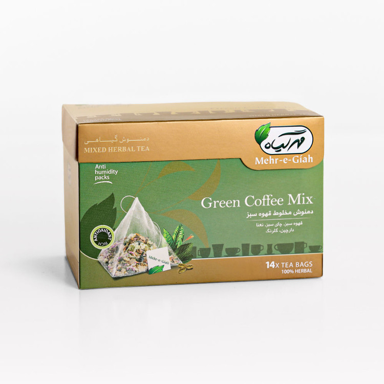 دمنوش مخلوط قهوه سبز تی بگ شامل دانههای قهوه سبز پودر شده در کیسه های کوچک است. با خرید دمنوش مخلوط قهوه سبز تی بگ می توانید طعم بی نظیر این قهوه را با ترکیبی از گیاهانی مانند نعنا، دارچین، چای سبز و گلرنگ تجربه کنید و از خواص آن نیز بهره مند شوید.