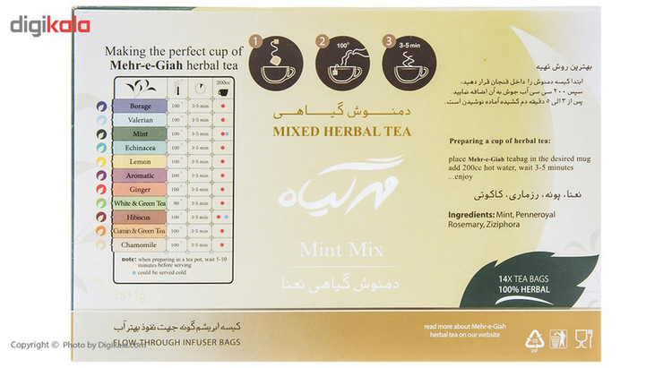 نعنا با توجه به بو و طعمی که دارد مورد توجه بسیاری از افراد قرار میگیرد. دمنوش نعنا جایگزین خوبی برای گیاه سبز نعنا است. دمنوش گیاهی نعنا مهرگیاه بسته 14 عددی در یک کیسه ارگانیک با قابلیت نفوذ آب بالا ارائه شده است. این مسئله موجب میشود تا شما راحتتر از این محصول استفاده کنید چون با ریختن آب جوش داخل لیوان و قرار دادن دمنوش کیسهای میتوانید بعد از 3-8 دقیقه این دمنوش را حاضر کنید. مصرف نعنا روی دستگاه گوارش شما تاثیری مثبت داشته و از بوی دهان جلوگیری میکند. همچنین شما میتوانید برای کاهش آلرژیهای فصلی از این دمنوش روزانه استفاده کنید. علاوه بر این اگر دچار سرماخوردگی هستید و گلودرد دارید با دمنوش گیاهی نعنا مهرگیاه بسته 14 عددی دهان را ضدعفونی کرده و تاحدودی از التهاب گلو جلوگیری کنید.