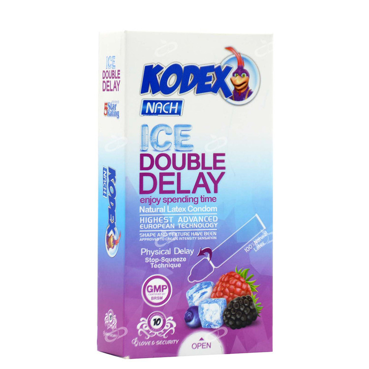 کاندوم آیس دابل دیلی کدکس محصول جدید شرکت کدکس است که با قابلیت ایجاد خنکی روی پوست، میتواند باعث تاخیر مضاعف شود. این کاندوم با حلقه تاخیری فیزیکی که دارد، از خروج فوری منی و کوتاه شدن زمان رابطه جلوگیری مینماید. حس سرد و خنکی یکی از ویژگیهای بارز کاندوم کدکس است که آقایان روی پوست آلت خود احساس میکنند. وجود مواد خاص در داخل این محصولات جنسی و روش اسکونیزینگ موجب تاخیر در انزال میشود. این روش در بسیاری از تحقیقات علمی بهترین روش برای ایجاد تاخیر شناخته شده است و فاقد هر گونه عارضه است. از دیگر مزایای حلقه لاتکس در کاندوم تاخیری این است که از نشت مایع انزالی به بیرون از کنارههای کاندوم جلوگیری مینماید و روی قیمت کاندوم تاثیر گذار است، بدین صورت شما میتوانید بعد از خارج شدن مایع نیز به دخول ادامه دهید.