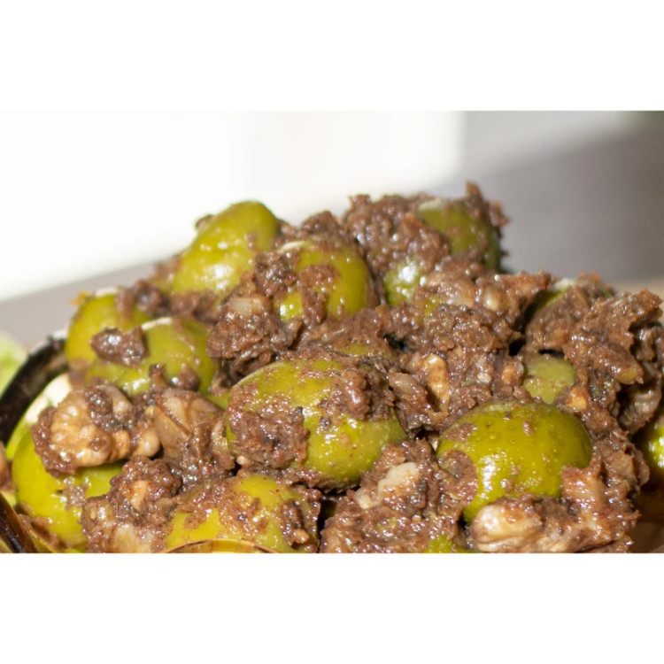 ترکیبات: زیتون سبز بی هسته + رب انار + گردو + سیر + نمک + سرکه تقطیری + ادویه + سبزی های معطر + آب
